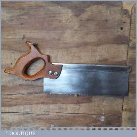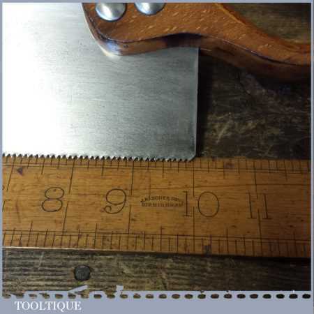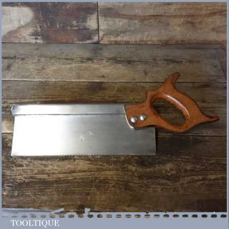 Vintage 10” steel back dovetail saw with 11 Tpi fully refurbished & sharpened rip cut ready for use. It looks to have a maker’s name on the saw plate but hard to distinguish (The woodworker?), although sharpened well. Note: minor ding in the saw plate although will have no effect on how the saw performs.