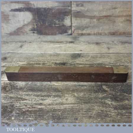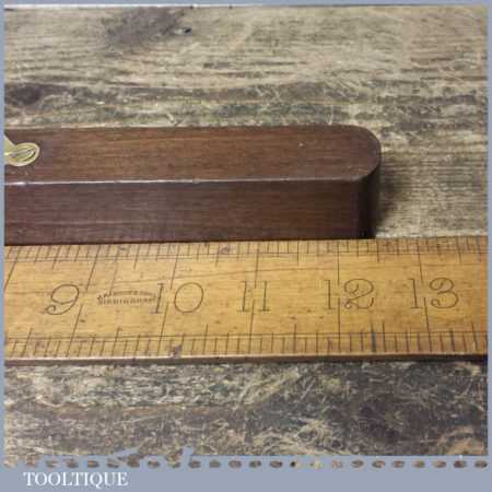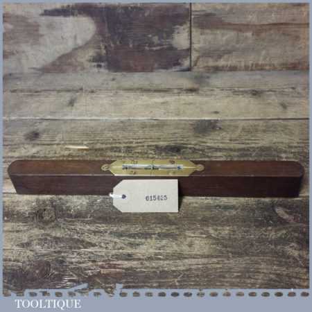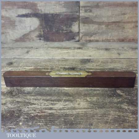Vintage 12 ½” mahogany and brass spirit level with clear glass bubble in good used condition. Note: the level hasn’t been tested and may require resetting in putty if intended for use.