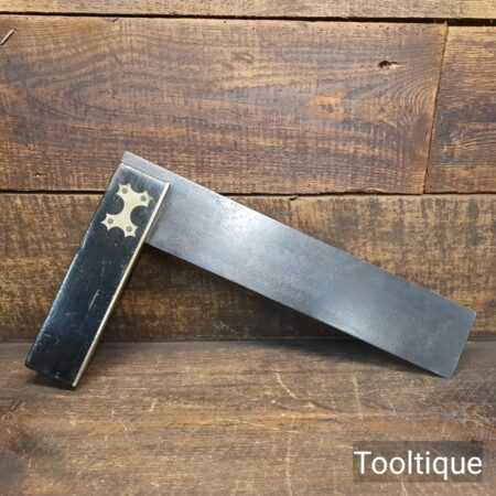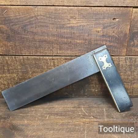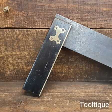 Vintage 12” Ebony & Brass carpenters square in good/fair used condition. Note: Surface pitting to the steel plate (see images) but is usable and has tested square.