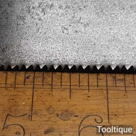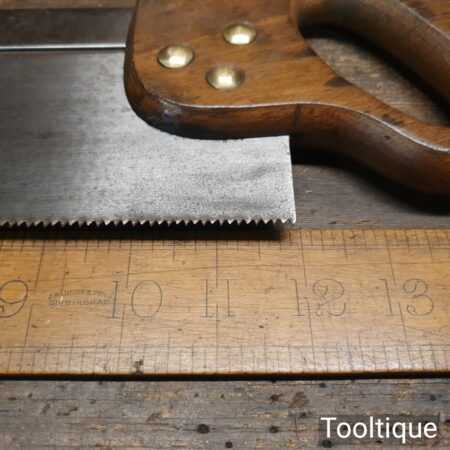 The saw has been thoroughly cleaned including under the handle, jointed, resharpened and set by hand so that all the hard work of getting an old vintage saw right has been undertaken. We do this so that the next sharpening is easier and no more than a quick freshen up would be required. Those who are familiar with sharpening will know this is no small job and requires skill, effort and time to achieve good results.