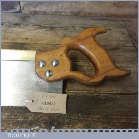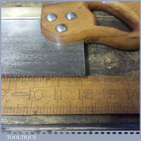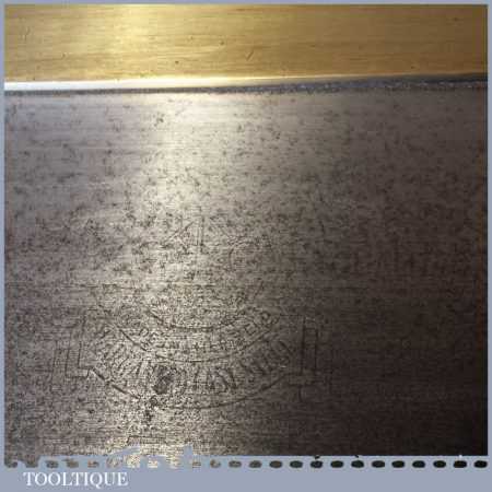 The saw has been thoroughly cleaned, jointed, resharpened and set by hand so that all the hard work of getting an old vintage saw right has been undertaken. We do this so that the next sharpening is easier and no more than a quick freshen up would be required. Those who are familiar with sharpening will know this is no small job and requires skill, effort and time to achieve good results.