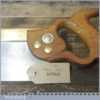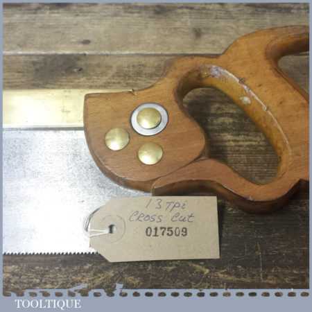 The saw has been thoroughly cleaned including under the handle, jointed, resharpened and set by hand so that all the hard work of getting an old vintage saw right has been undertaken. We do this so that the next sharpening is easier and no more than a quick freshen up would be required. Those who are familiar with sharpening will know this is no small job and requires skill, effort and time to achieve good results.
