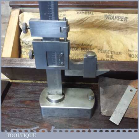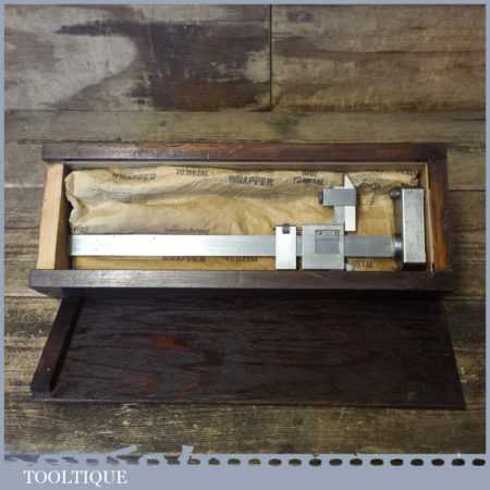 Vintage 12” vernier imperial height gauge stamped NSF Croydon England in a pine box, in good used condition.