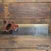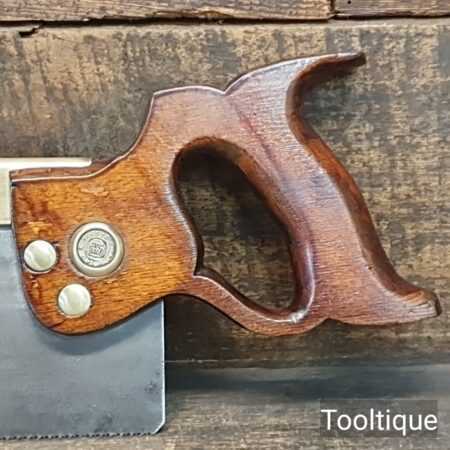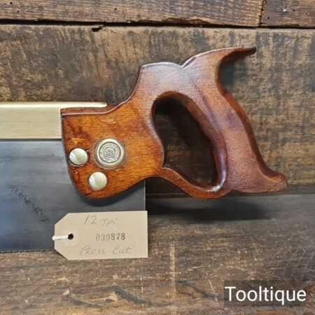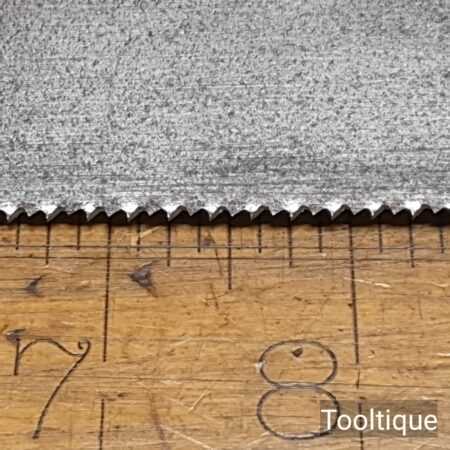 The saw has been thoroughly cleaned, jointed, resharpened and set by hand so that all the hard work of getting an old vintage saw right has been undertaken. We do this so that the next sharpening is easier and no more than a quick freshen up would be required. Those who are familiar with sharpening will know this is no small job and requires skill, effort and time to achieve good results.