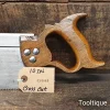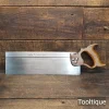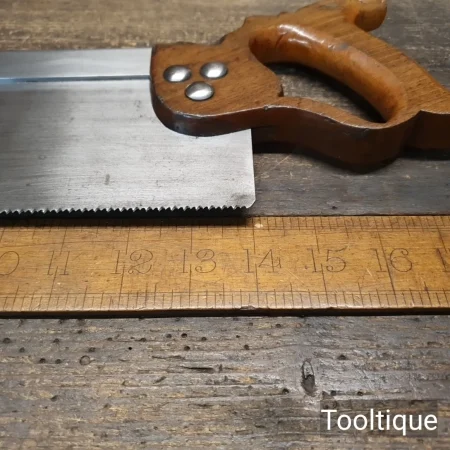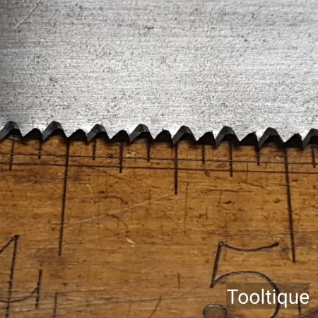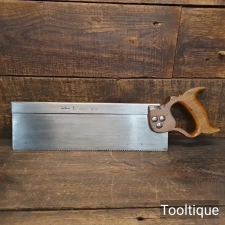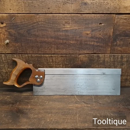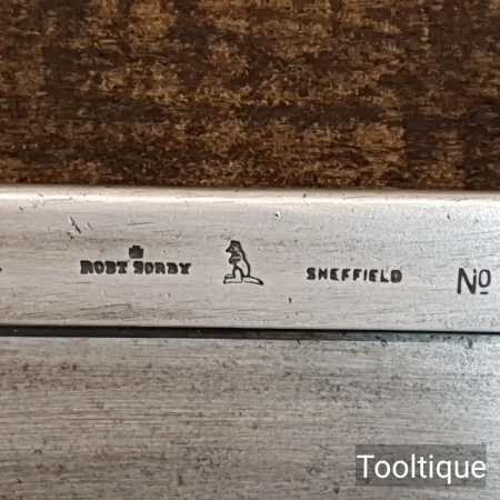 Vintage 14” Robert Sorby No: 39 Steel Back, Cross Cut Bench Saw with 10 Tpi, fully refurbished & Sharpened ready for use and in good used condition. Note: Sharpened using all three disciplines of Slope, Rake and Fleam for a more efficient cut. The saw has been thoroughly cleaned, jointed, resharpened and set by hand so that all the hard work of getting an old vintage saw right has been undertaken. We do this so that the next sharpening is easier and no more than a quick freshen up would be required. Those who are familiar with sharpening will know this is no small job and requires skill, effort and time to achieve good results.
