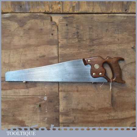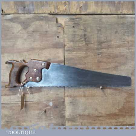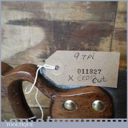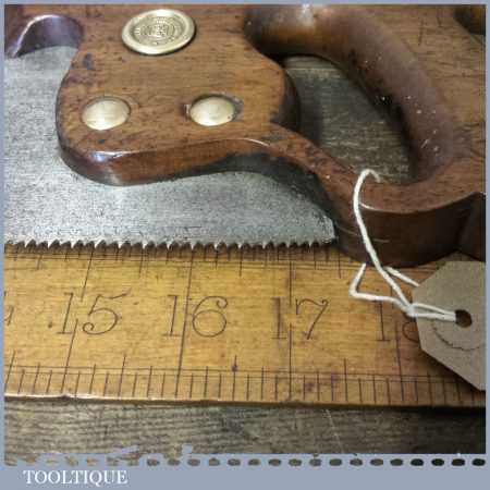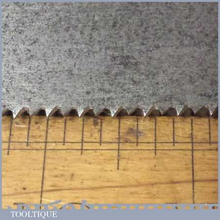 The saw has been thoroughly cleaned, jointed, resharpened and set by hand so that all the hard work of getting an old vintage saw right has been undertaken. We do this so that the next sharpening is easier and no more than a quick freshen up would be required. Those who are familiar with sharpening will know this is no small job and requires skill, effort and time to achieve good results.