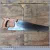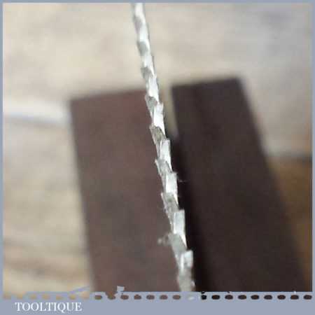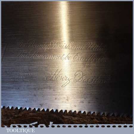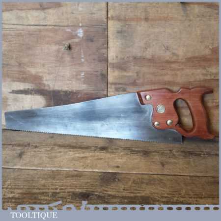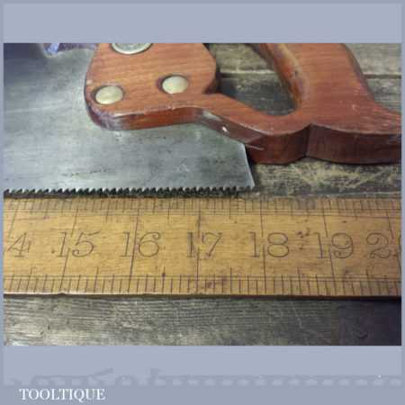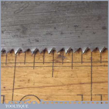 The saw has been thoroughly cleaned, jointed, resharpened and set by hand so that all the hard work of getting an old vintage saw right has been undertaken. We do this so that the next sharpening is easier and no more than a quick freshen up would be required. Those who are familiar with sharpening will know this is no small job and requires skill, effort and time to achieve good results.