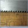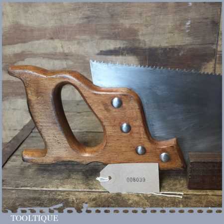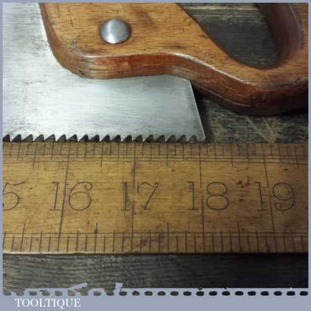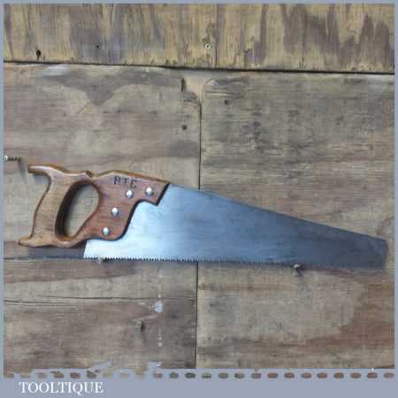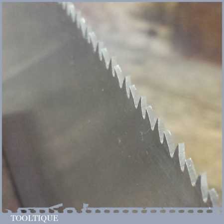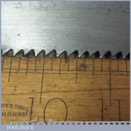 The saw has been thoroughly cleaned, jointed, resharpened and set by hand so that all the hard work of getting an old vintage saw right has been undertaken. We do this so that the next sharpening is easier and no more than a quick freshen up would be required. Those who are familiar with sharpening will know this is no small job and requires skill, effort and time to achieve good results.