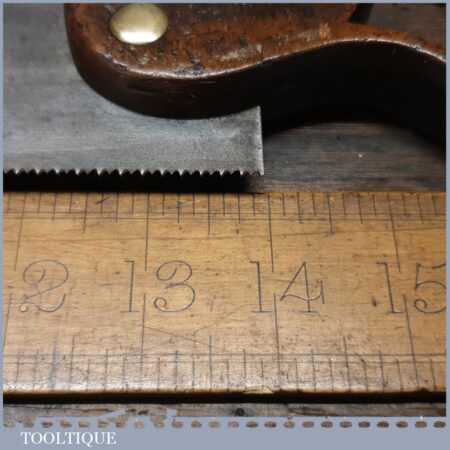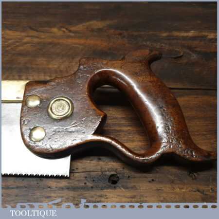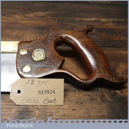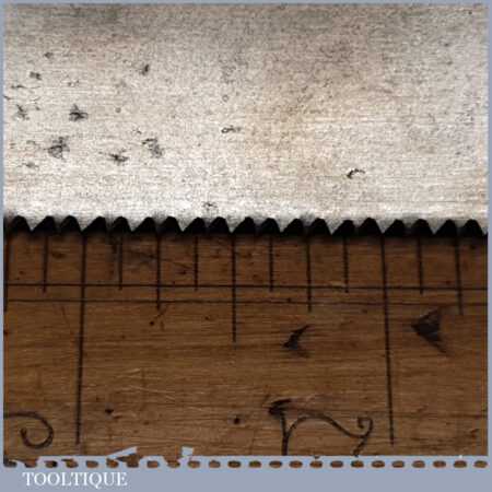 The saw has been thoroughly cleaned including under the handle, jointed, resharpened and set by hand so that all the hard work of getting an old vintage saw right has been undertaken. We do this so that the next sharpening is easier and no more than a quick freshen up would be required. Those who are familiar with sharpening will know this is no small job and requires skill, effort and time to achieve good results