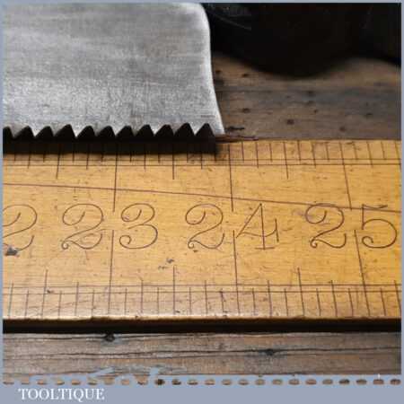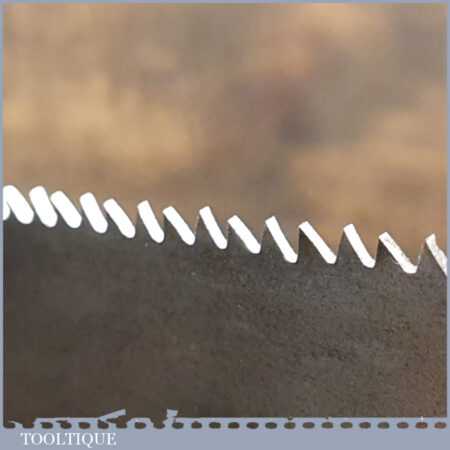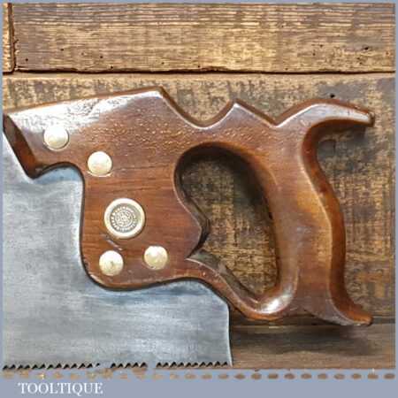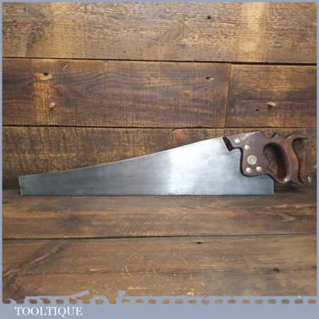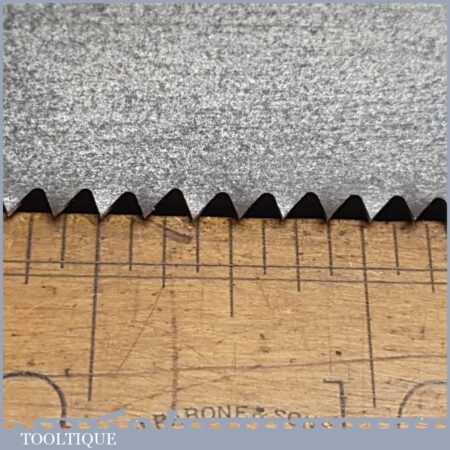 The saw has been thoroughly cleaned, jointed, resharpened and set by hand so that all the hard work of getting an old vintage saw right has been undertaken. We do this so that the next sharpening is easier and no more than a quick freshen up would be required. Those who are familiar with sharpening will know this is no small job and requires skill, effort and time to achieve good results.