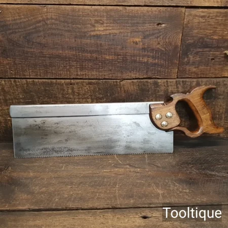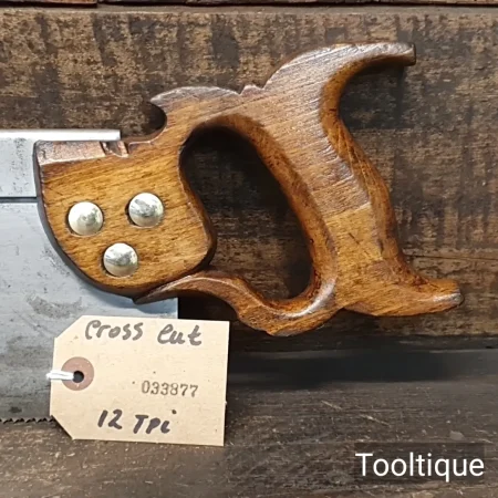 Vintage 1960’s English 14” Steel Back Cross Cut 12 Tpi Bench Saw, sharpened ready for use and in good used condition. Note: Etching has faded and reason for no makers mark, having sharpened it I can attest the quality of the saw plate is there and would rival anything you can buy today. The saw has been sharpened using all three disciplines of slope, fleam and rake for a more precise and efficient cut. The saw has been thoroughly cleaned, jointed, resharpened and set by hand so that all the hard work of getting an old vintage saw right has been undertaken. We do this so that the next sharpening is easier and no more than a quick freshen up would be required. Those who are familiar with sharpening will know this is no small job and requires skill, effort and time to achieve good results.