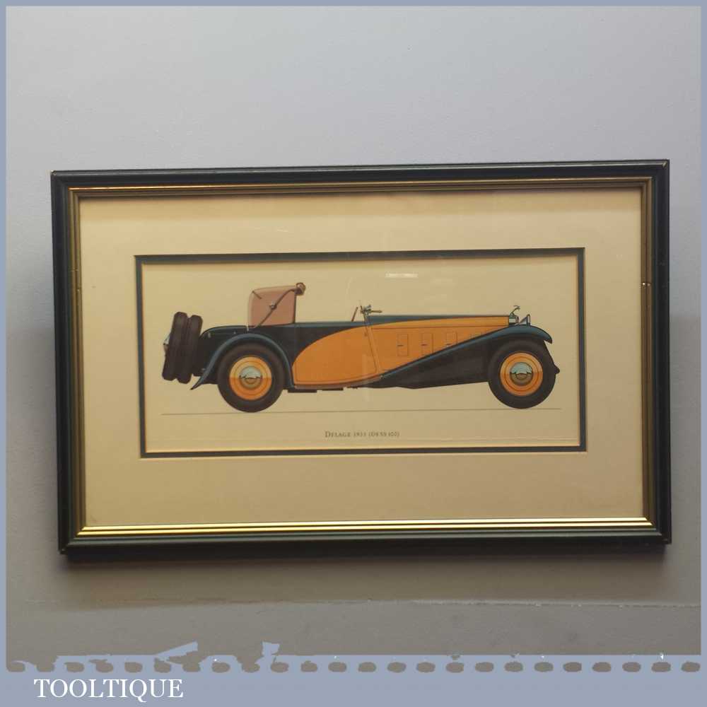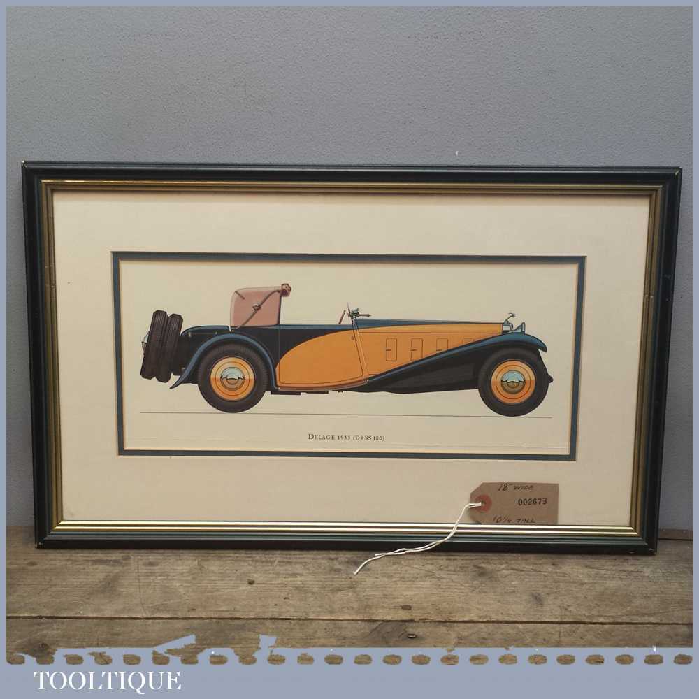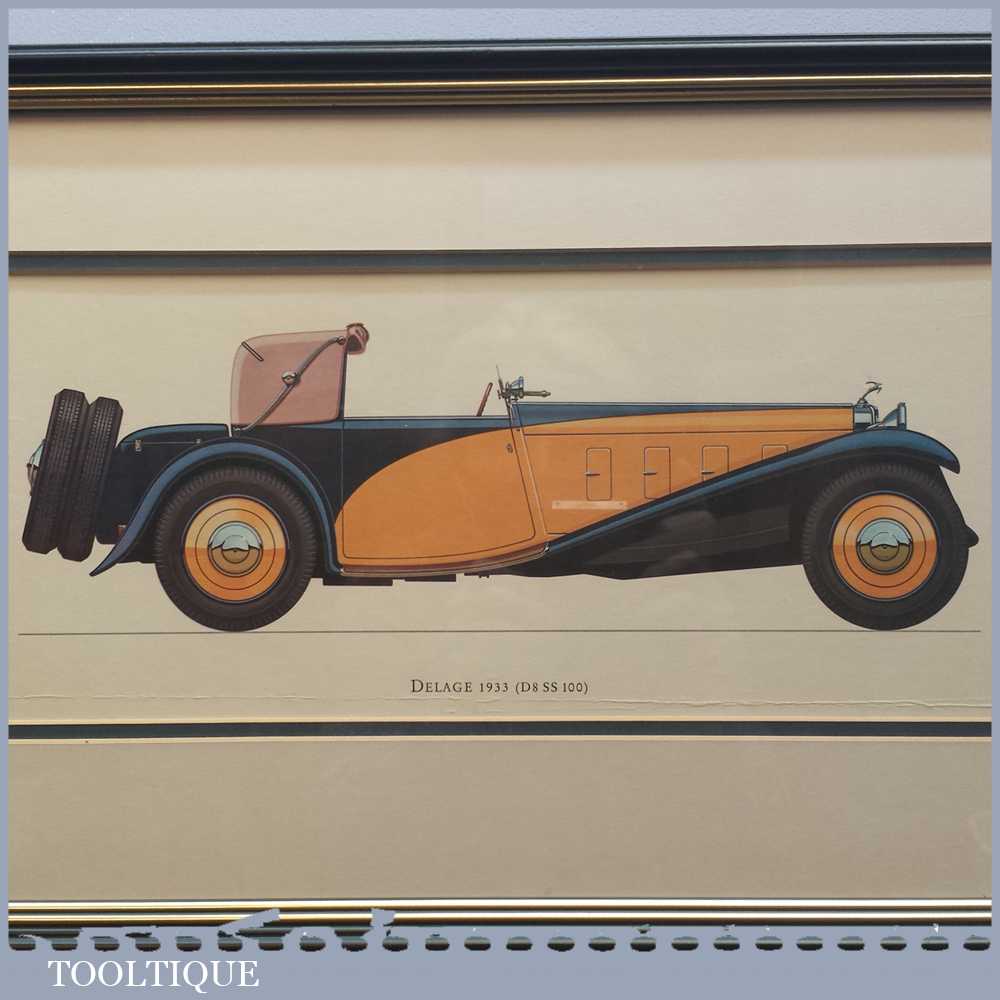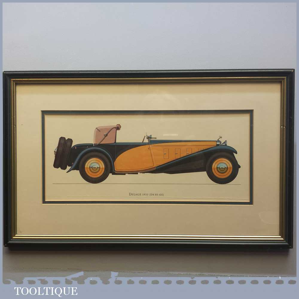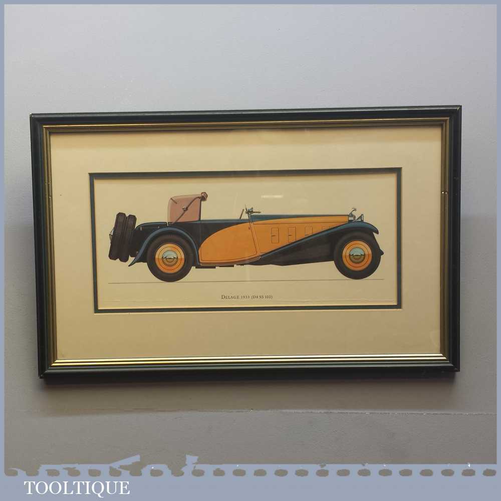 Vintage framed 1960’s Lithograph Car memorabilia Print of a Delage 1933 (D8 SS 100) in good overall condition for its age, see images.