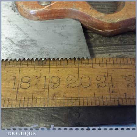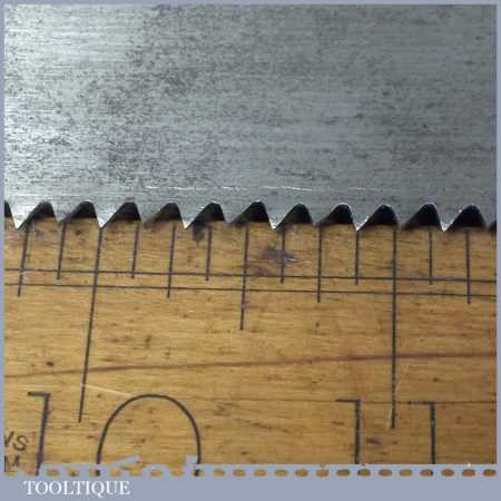 The saw has been thoroughly cleaned, jointed, resharpened and set by hand so that all the hard work of getting an old vintage saw right has been undertaken. We do this so that the next sharpening is easier and no more than a quick freshen up would be required. Those who are familiar with sharpening will know this is no small job and requires skill, effort and time to achieve good results.
