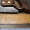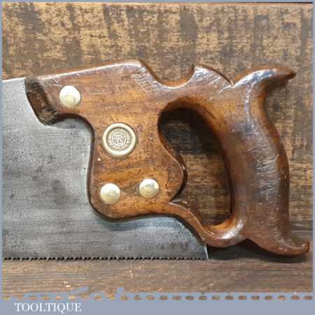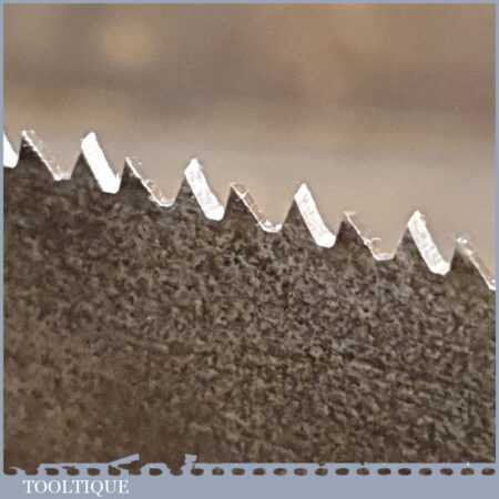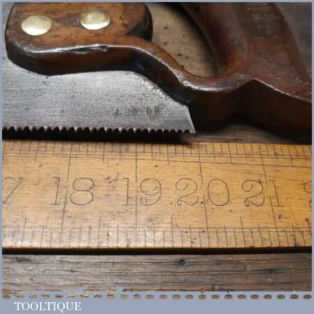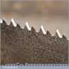 The saw has been thoroughly cleaned, jointed, resharpened and set by hand so that all the hard work of getting an old vintage saw right has been undertaken. We do this so that the next sharpening is easier and no more than a quick freshen up would be required. Those who are familiar with sharpening will know this is no small job and requires skill, effort and time to achieve good results.