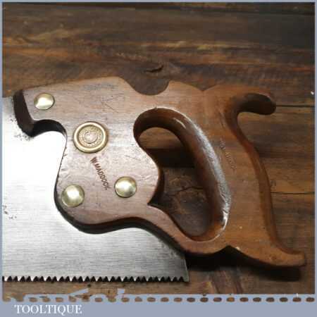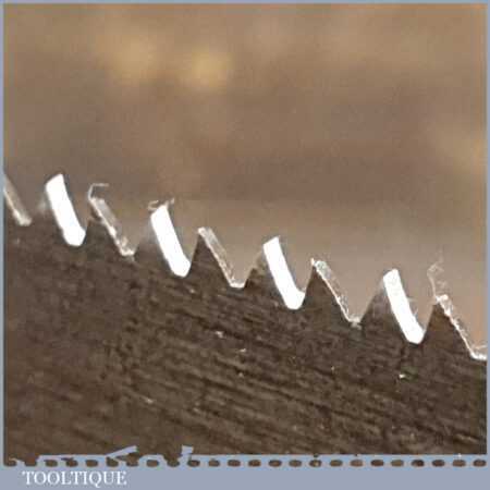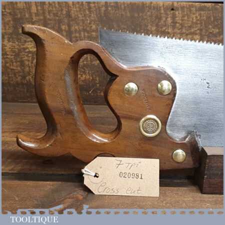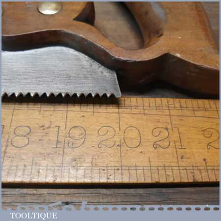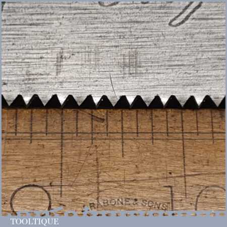 The saw has been thoroughly cleaned, jointed, resharpened and set by hand so that all the hard work of getting an old vintage saw right has been undertaken. We do this so that the next sharpening is easier and no more than a quick freshen up would be required. Those who are familiar with sharpening will know this is no small job and requires skill, effort and time to achieve good results.