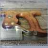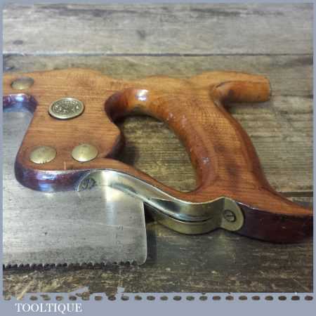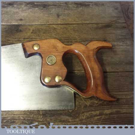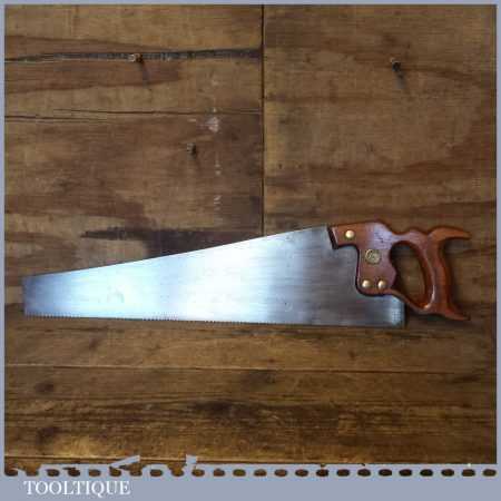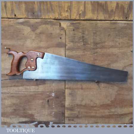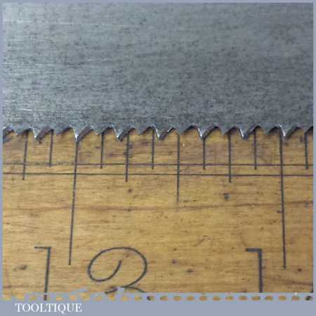 The saw has been thoroughly cleaned, jointed, resharpened and set by hand so that all the hard work of getting an old vintage saw right has been undertaken. We do this so that the next sharpening is easier and no more than a quick freshen up would be required. Those who are familiar with sharpening will know this is no small job and requires skill, effort and time to achieve good results.