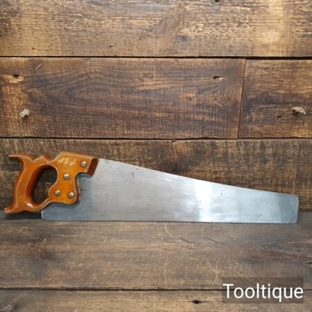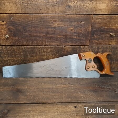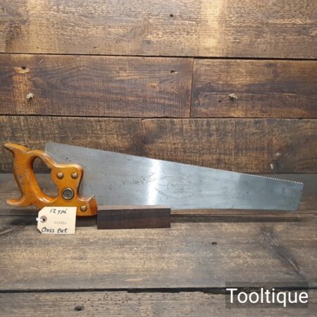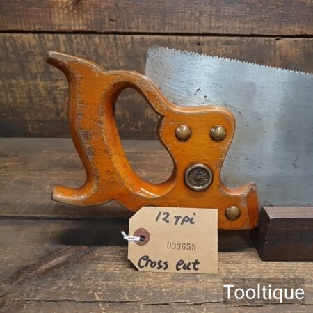 Crisp Vintage 20” W. Tyzack Turner 12 Tpi Nonpareil Cross Cut Panel saw, sharpened ready for use and in good used condition. Note: Sharpened using all three disciplines of Slope, Rake and Fleam for a cleaner more efficient cut, Tight fitting Handle. The saw has been thoroughly cleaned, jointed, resharpened and set by hand so that all the hard work of getting an old vintage saw right has been undertaken. We do this so that the next sharpening is easier and no more than a quick freshen up would be required. Those who are familiar with sharpening will know this is no small job and requires skill, effort and time to achieve good results.