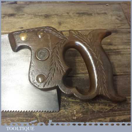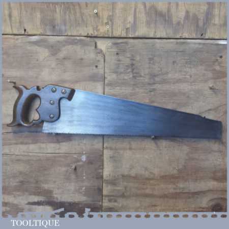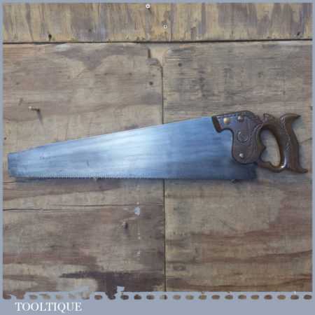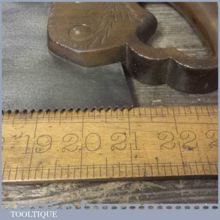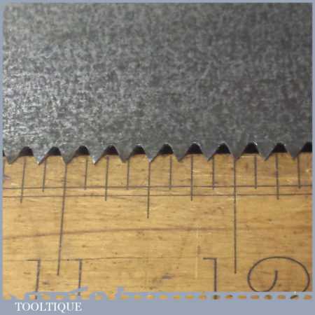 The saw has been thoroughly cleaned, jointed, resharpened and set by hand so that all the hard work of getting an old vintage saw right has been undertaken. We do this so that the next sharpening is easier and no more than a quick freshen up would be required. Those who are familiar with sharpening will know this is no small job and requires skill, effort and time to achieve good results.
