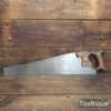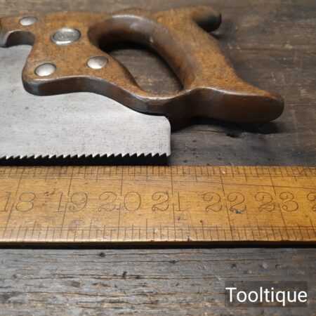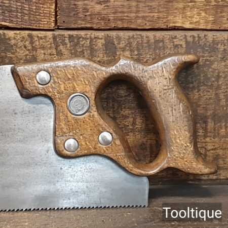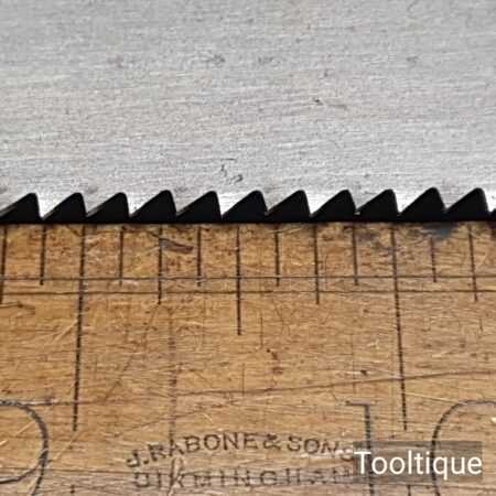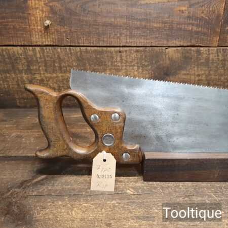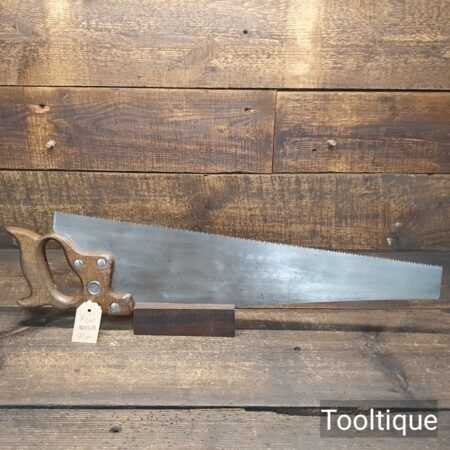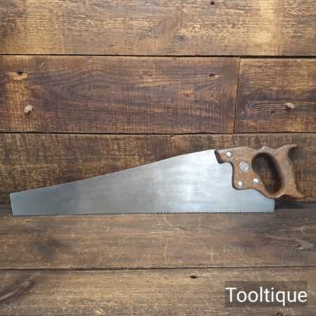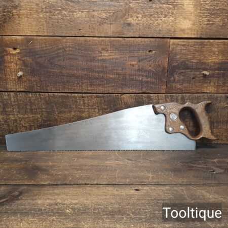 Vintage 21” Henry Disston USA Rip Hand Saw with 7 Tpi, fully refurbished ready for use and in good used condition. Sharpened with a relaxed rake at the toe and increasing in aggressiveness towards the handle. The saw has been thoroughly cleaned, jointed, resharpened and set by hand so that all the hard work of getting an old vintage saw right has been undertaken. We do this so that the next sharpening is easier and no more than a quick freshen up would be required. Those who are familiar with sharpening will know this is no small job and requires skill, effort and time to achieve good results.