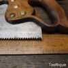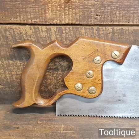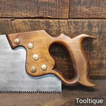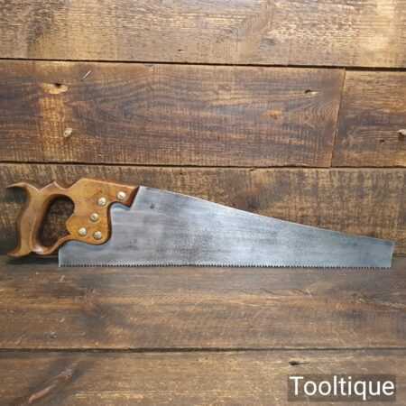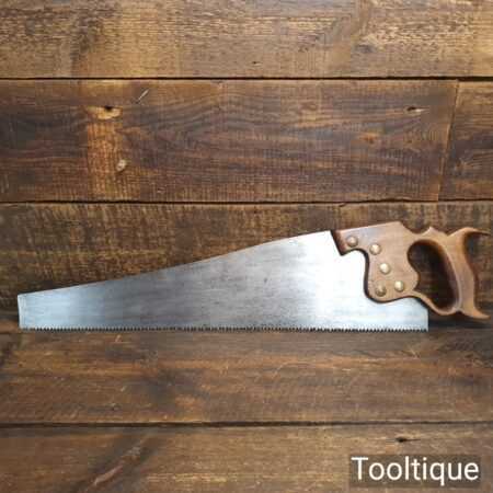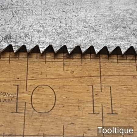 The saw has been thoroughly cleaned, jointed, resharpened, and set by hand so that all the hard work of getting an old vintage saw right has been undertaken. We do this so that the next sharpening is easier and no more than a quick freshen up would be required. Those who are familiar with sharpening will know this is no small job and requires skill, effort, and time to achieve good results.
