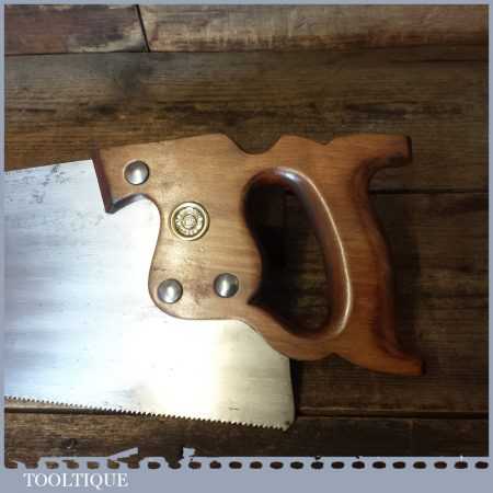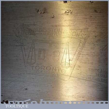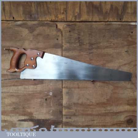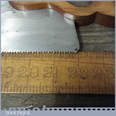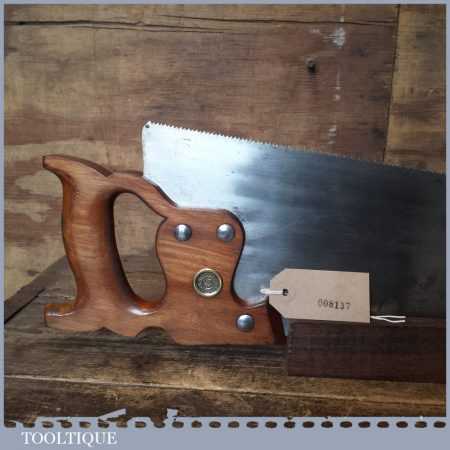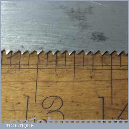 The saw has been thoroughly cleaned, jointed, resharpened and set by hand so that all the hard work of getting an old vintage saw right has been undertaken. We do this so that the next sharpening is easier and no more than a quick freshen up would be required. Those who are familiar with sharpening will know this is no small job and requires skill, effort and time to achieve good results.