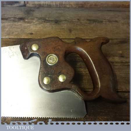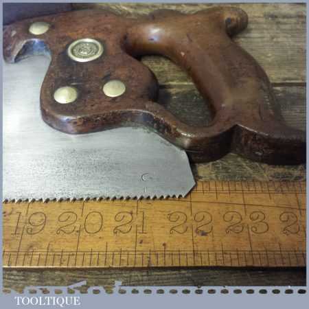 The saw has been thoroughly cleaned, jointed, resharpened and set by hand so that all the hard work of getting an old vintage saw right has been undertaken. We do this so that the next sharpening is easier and no more than a quick freshen up would be required. Those who are familiar with sharpening will know this is no small job and requires skill, effort and time to achieve good results.