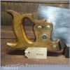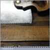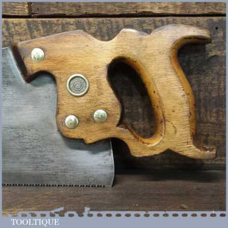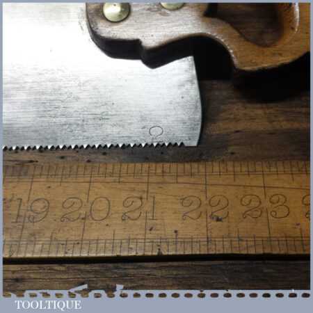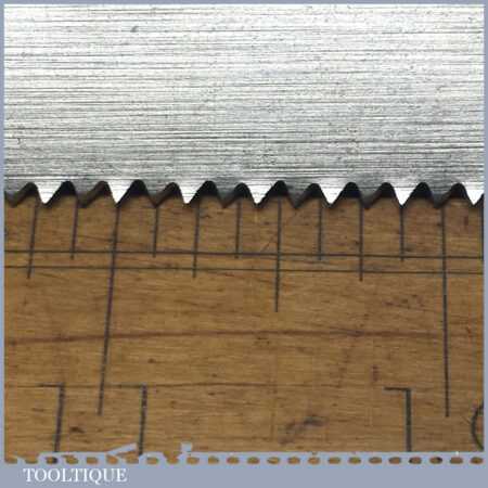 The saw has been thoroughly cleaned, jointed, resharpened and set by hand so that all the hard work of getting an old vintage saw right has been undertaken. We do this so that the next sharpening is easier and no more than a quick freshen up would be required. Those who are familiar with sharpening will know this is no small job and requires skill, effort and time to achieve good results.