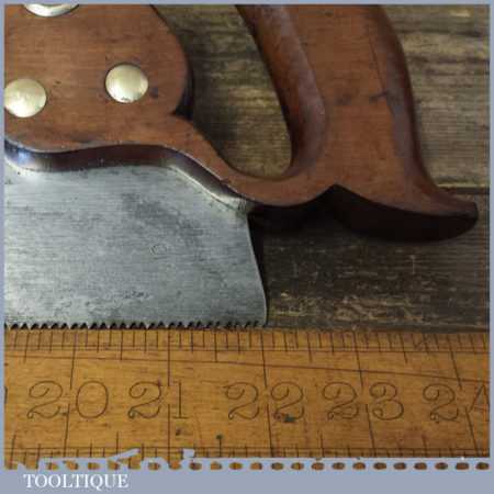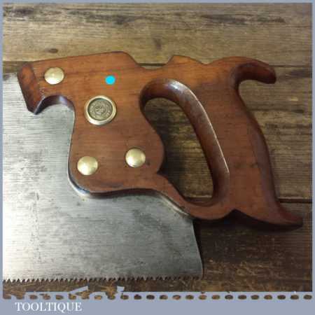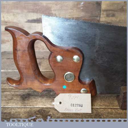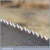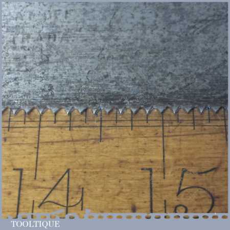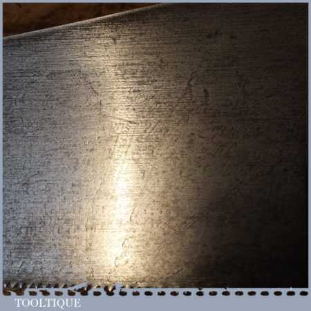 The saw has been thoroughly cleaned, jointed, resharpened and set by hand so that all the hard work of getting an old vintage saw right has been undertaken. We do this so that the next sharpening is easier and no more than a quick freshen up would be required. Those who are familiar with sharpening will know this is no small job and requires skill, effort and time to achieve good results.
