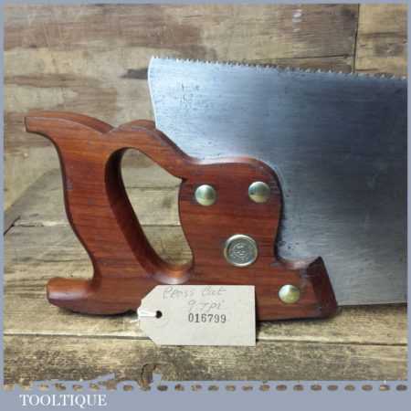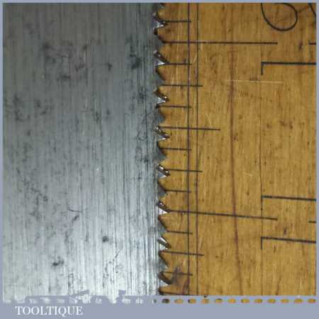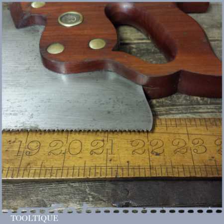 The saw has been thoroughly cleaned, jointed, resharpened and set by hand so that all the hard work of getting an old vintage saw right has been undertaken. We do this so that the next sharpening is easier and no more than a quick freshen up would be required. Those who are familiar with sharpening will know this is no small job and requires skill, effort and time to achieve good results.