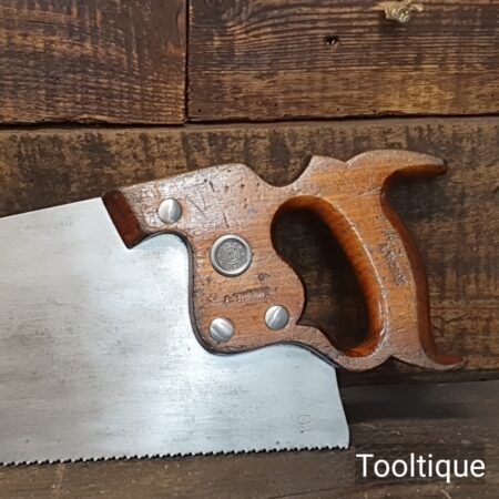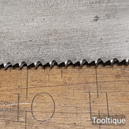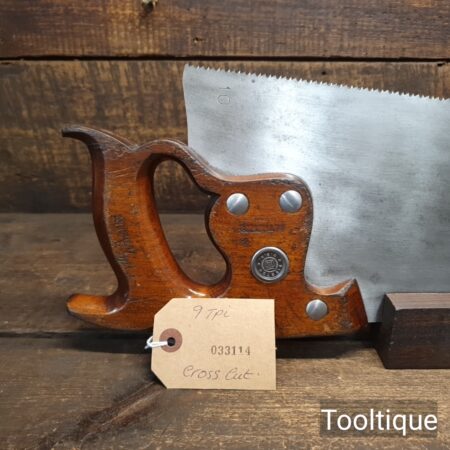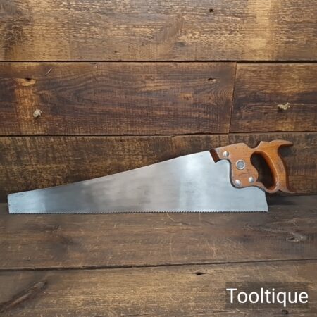 Vintage 22” Henry Disston USA Cross Cut Panel Saw with 9 Tpi, Sharpened ready for use and in good used condition. Note: Sharpened using all three disciplines of Rake, Slope & Fleam. The saw has been thoroughly cleaned, jointed, resharpened and set by hand so that all the hard work of getting an old vintage saw right has been undertaken. We do this so that the next sharpening is easier and no more than a quick freshen up would be required. Those who are familiar with sharpening will know this is no small job and requires skill, effort and time to achieve good results.