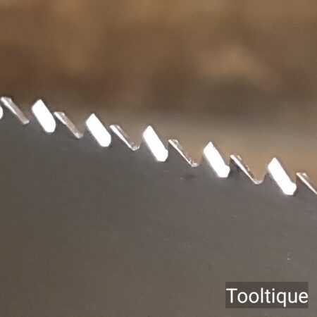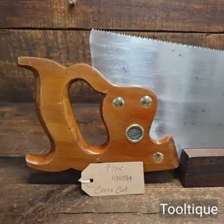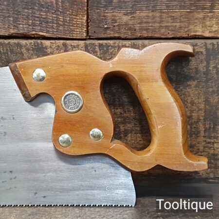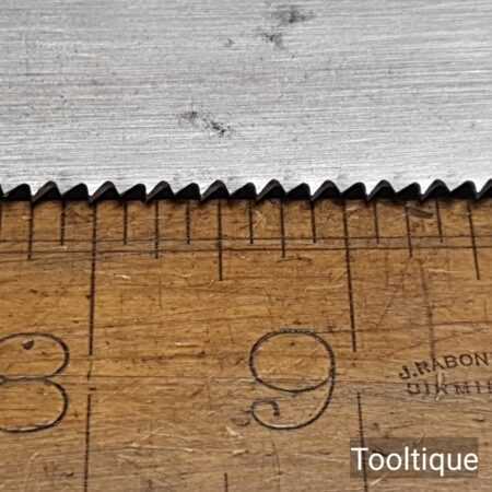 The saw has been thoroughly cleaned, jointed, resharpened and set by hand so that all the hard work of getting an old vintage saw right has been undertaken. We do this so that the next sharpening is easier and no more than a quick freshen up would be required. Those who are familiar with sharpening will know this is no small job and requires skill, effort and time to achieve good results.