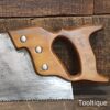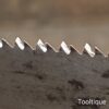 Vintage 22” Spear & Jackson Cross Cut Panel Saw with 9 Tpi, refurbished & sharpened ready for use and in good used condition. Note: Age approx 1970’s sharpened using all three disciplines of slope, rake, Fleam. The saw has been thoroughly cleaned, jointed, resharpened and set by hand so that all the hard work of getting an old vintage saw right has been undertaken. We do this so that the next sharpening is easier and no more than a quick freshen up would be required. Those who are familiar with sharpening will know this is no small job and requires skill, effort and time to achieve good results.