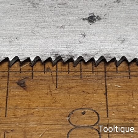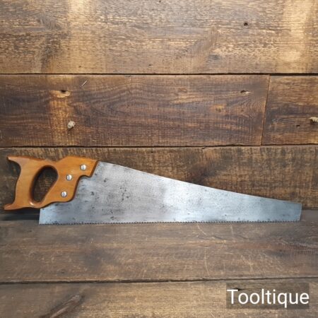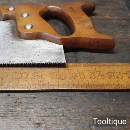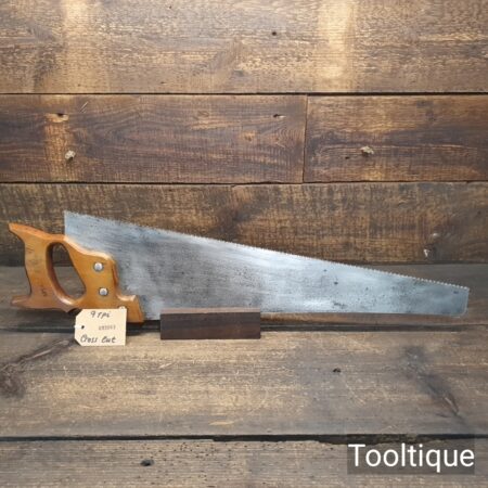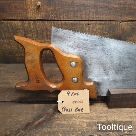 Vintage 22” Spear & Jackson Cross Cut Panel Saw with 9 Tpi, refurbished & sharpened ready for use and in good used condition. Note: Age approx 1970’s sharpened using all three disciplines of slope, rake, Fleam. The saw has been thoroughly cleaned, jointed, resharpened and set by hand so that all the hard work of getting an old vintage saw right has been undertaken. We do this so that the next sharpening is easier and no more than a quick freshen up would be required. Those who are familiar with sharpening will know this is no small job and requires skill, effort and time to achieve good results.
