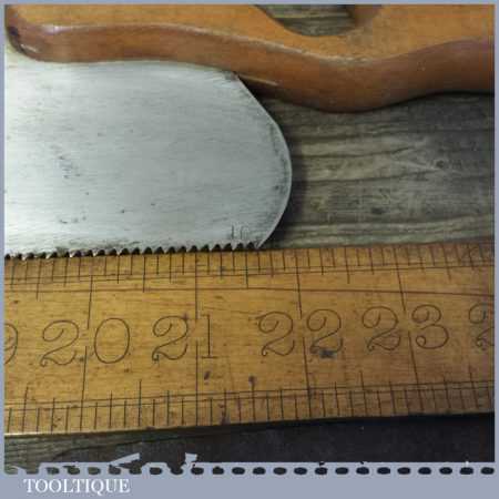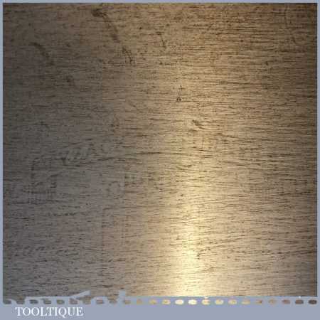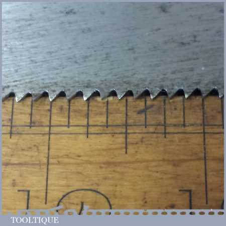 The saw has been thoroughly cleaned, jointed, resharpened and set by hand so that all the hard work of getting an old vintage saw right has been undertaken. We do this so that the next sharpening is easier and no more than a quick freshen up would be required. Those who are familiar with sharpening will know this is no small job and requires skill, effort and time to achieve good results.