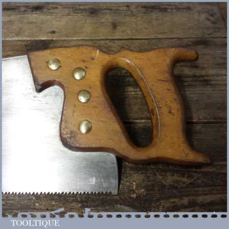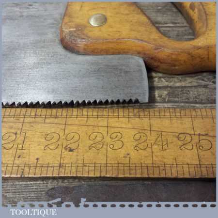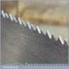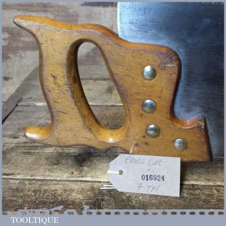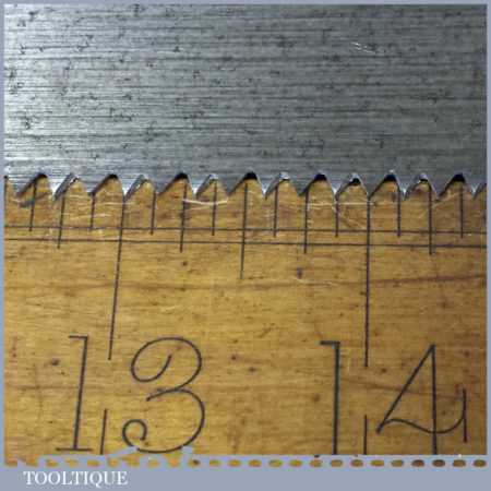The saw has been thoroughly cleaned, jointed, resharpened and set by hand so that all the hard work of getting an old vintage saw right has been undertaken. We do this so that the next sharpening is easier and no more than a quick freshen up would be required. Those who are familiar with sharpening will know this is no small job and requires skill, effort and time to achieve good results.