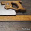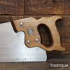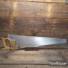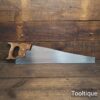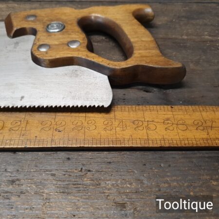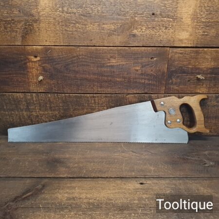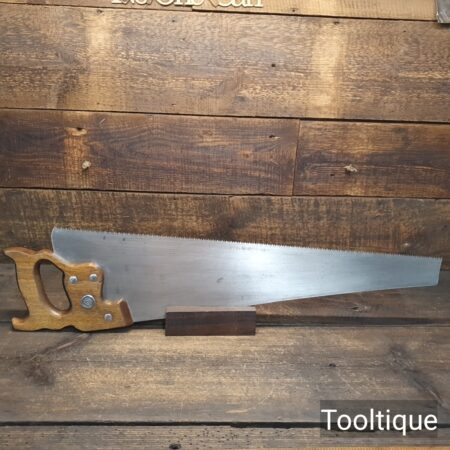 Vintage 24” Henry Disston Canadian 7 Tpi Rip Saw, refurbished ready for use and in good used condition. These May Not have the Reputation of the earlier Philli Types but that’s to do with design and not the steel which is far superior to what you can buy today. Note: Ideal sized teeth for hardwoods and has been sharpened with a relaxed toe to aid an easier start (less likely to snatch) gradually gaining aggression towards the handle. The saw has been thoroughly cleaned, jointed, resharpened and set by hand so that all the hard work of getting an old vintage saw right has been undertaken. We do this so that the next sharpening is easier and no more than a quick freshen up would be required. Those who are familiar with sharpening will know this is no small job and requires skill, effort and time to achieve good results.
