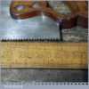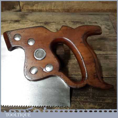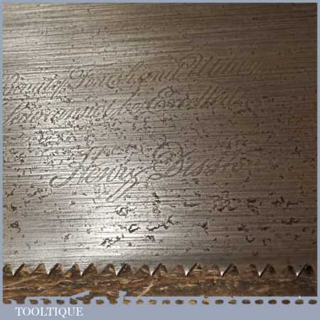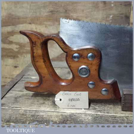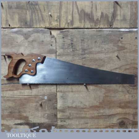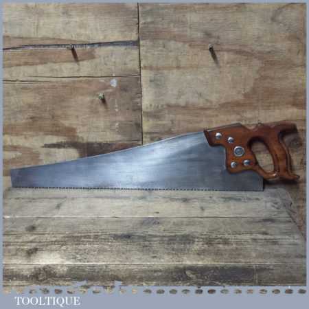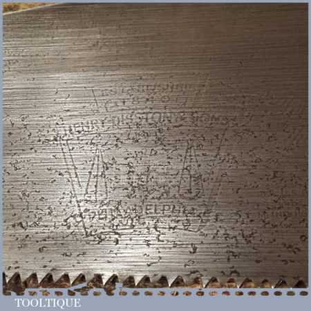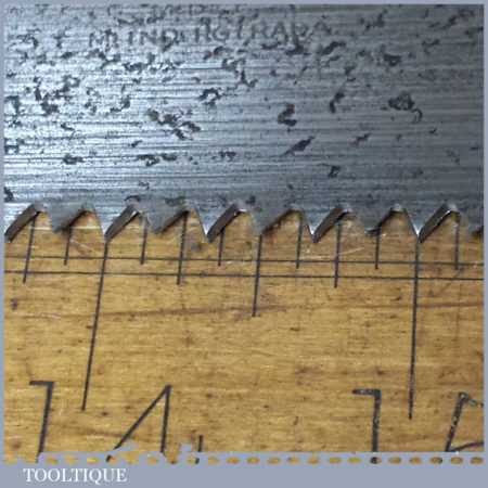 The saw has been thoroughly cleaned including under the handle, jointed, resharpened and set by hand so that all the hard work of getting an old vintage saw right has been undertaken. We do this so that the next sharpening is easier and no more than a quick freshen up would be required. Those who are familiar with sharpening will know this is no small job and requires skill, effort and time to achieve good results.