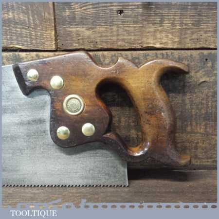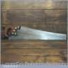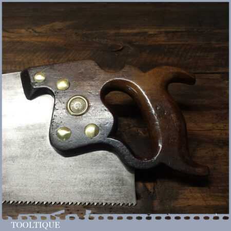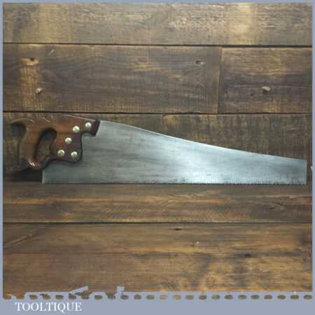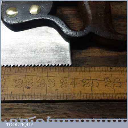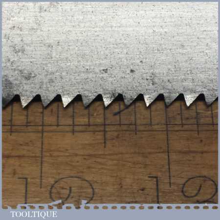The saw has been thoroughly cleaned, jointed, resharpened and set by hand so that all the hard work of getting an old vintage saw right has been undertaken. We do this so that the next sharpening is easier and no more than a quick freshen up would be required. Those who are familiar with sharpening will know this is no small job and requires skill, effort and time to achieve good results.