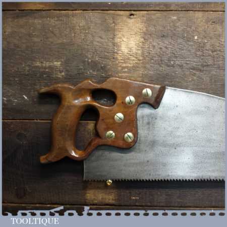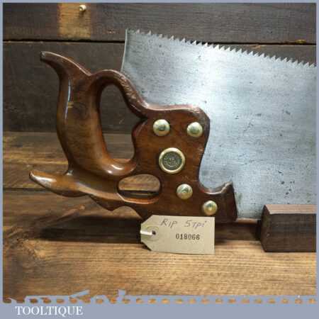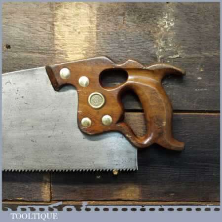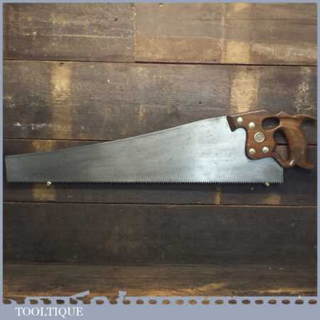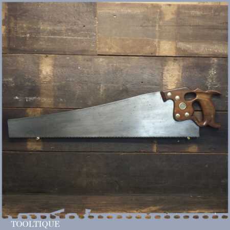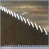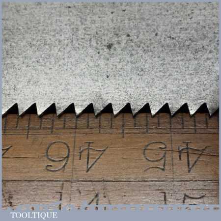 The saw has been thoroughly cleaned, jointed, resharpened and set by hand so that all the hard work of getting an old vintage saw right has been undertaken. We do this so that the next sharpening is easier and no more than a quick freshen up would be required. Those who are familiar with sharpening will know this is no small job and requires skill, effort and time to achieve good results.