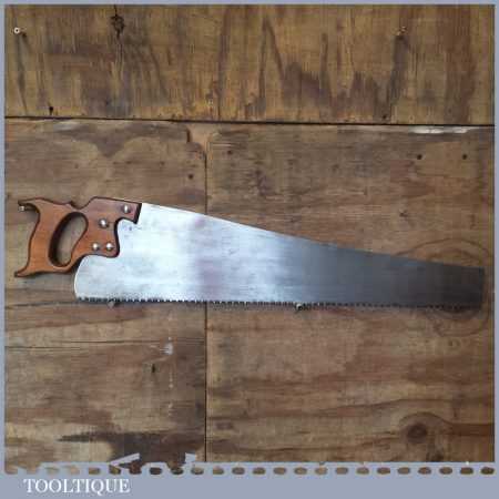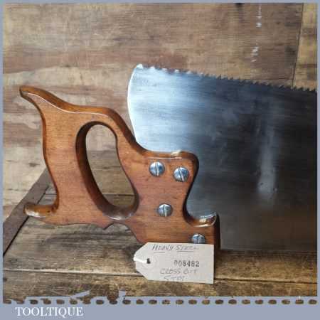 Vintage 26” Carpenters cross cut saw with 5 TPI which has been fully refurbished and sharpened ready for use. The saw plate is a little thicker than normal and therefore less flexible, probably to enable the user to use a bit more force. This took some work to get this one right but certainly worth the effort as it’s got quality steel. It’s a shame it’s lost its makers mark to research it further, however it’s almost certainly good quality Sheffield steel.