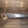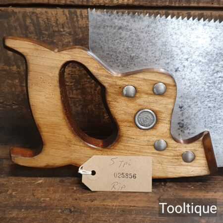 Vintage 26” Disston Canada rip saw with 5 tpi, fully refurbished and sharpened ready for use. These may not have the same reputation as the early Philly saws but they certainly compete in quality with the best of the rest. Note: There was a split to the handle where the medallion stud was over tightened but this has been repaired and this causes no issues when used.