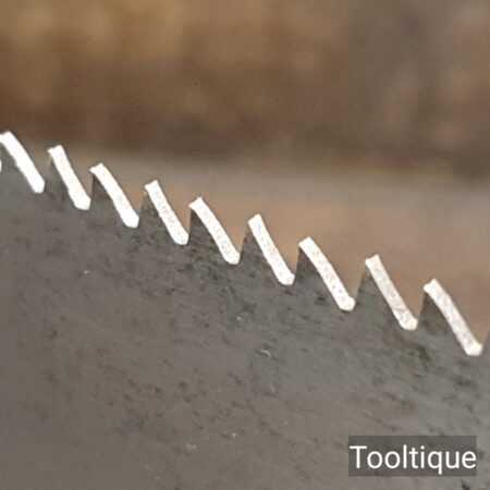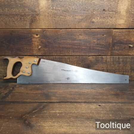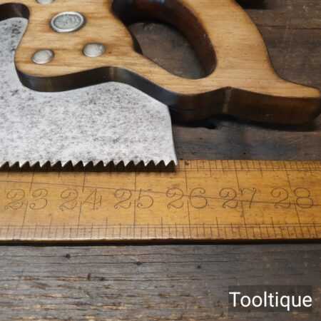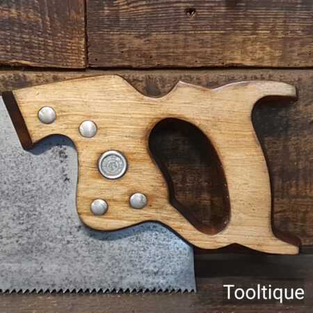 The saw has been thoroughly cleaned, jointed, resharpened, and set by hand so that all the hard work of getting an old vintage saw right has been undertaken. We do this so that the next sharpening is easier and no more than a quick freshen up would be required. Those who are familiar with sharpening will know this is no small job and requires skill, effort, and time to achieve good results.