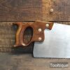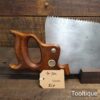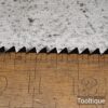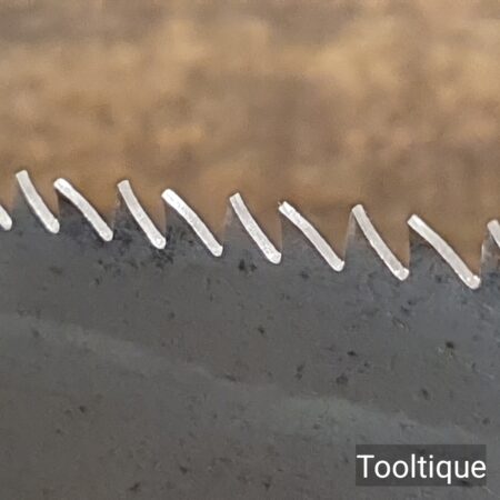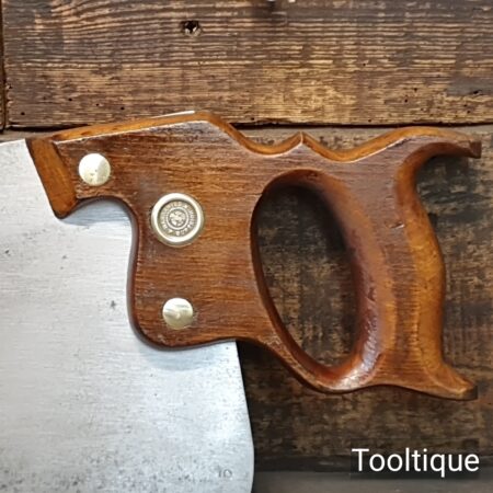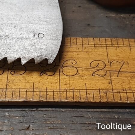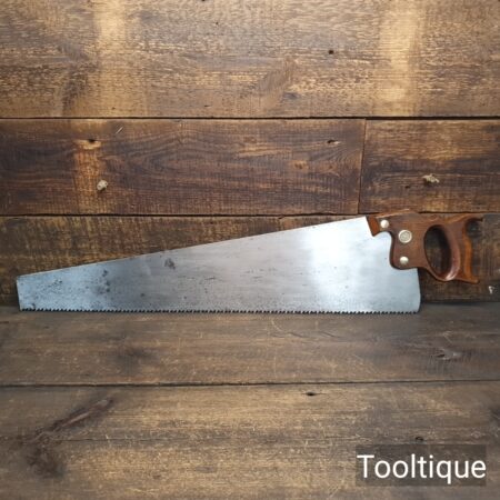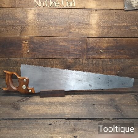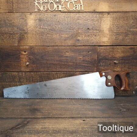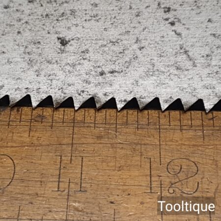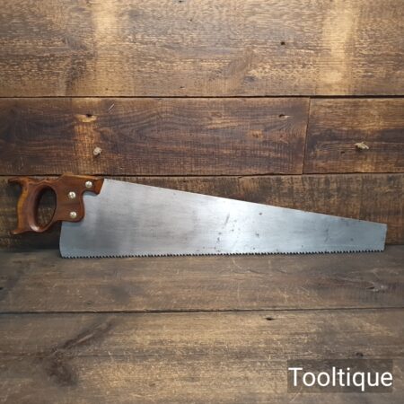 Vintage 26” English Warranted Superior 4 Tpi Rip Handsaw, refurbished, ready for use, and in good used condition. This is actually a nice saw, but the maker’s name etching/label is lost. Note: Sharpened with a relaxed rake at the toe for an easier start and to reduce the likelihood of snatching whilst gradually gaining in aggression towards the handle.