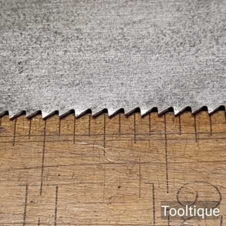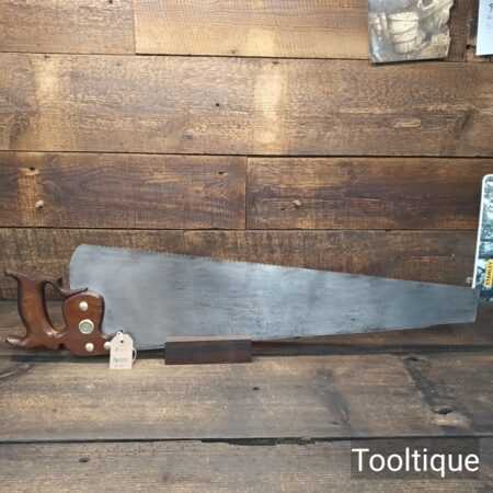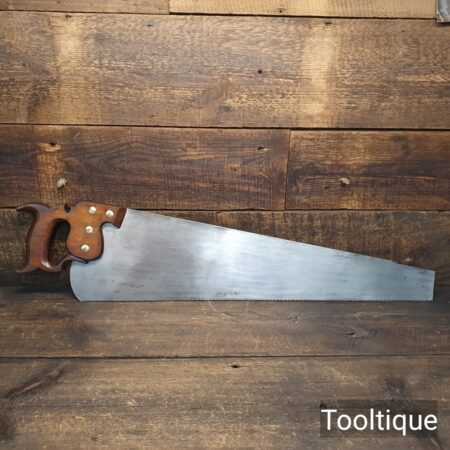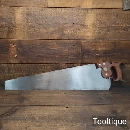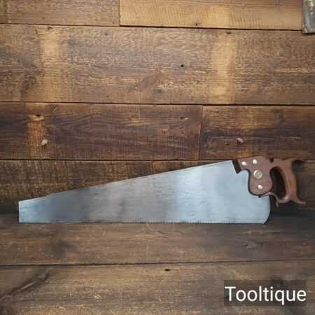 Vintage 26” Henry Disston Philadelphia 7 Tpi Rip Handsaw refurbished ready for use and in good used condition. The saw has been sharpened Rip with a relaxed rake at the toe for easy start progressively increasing in aggressiveness towards the handle. Note: The finer tooth Rip is more suited to hardwoods where the quality cut needs to be more refined when cutting by Hand. The saw has been thoroughly cleaned, jointed, resharpened and set by hand so that all the hard work of getting an old vintage saw right has been undertaken. We do this so that the next sharpening is easier and no more than a quick freshen up would be required. Those who are familiar with sharpening will know this is no small job and requires skill, effort and time to achieve good results.