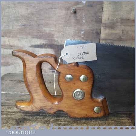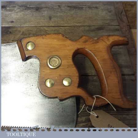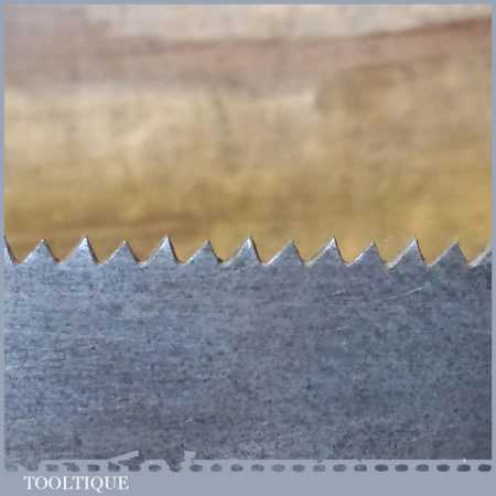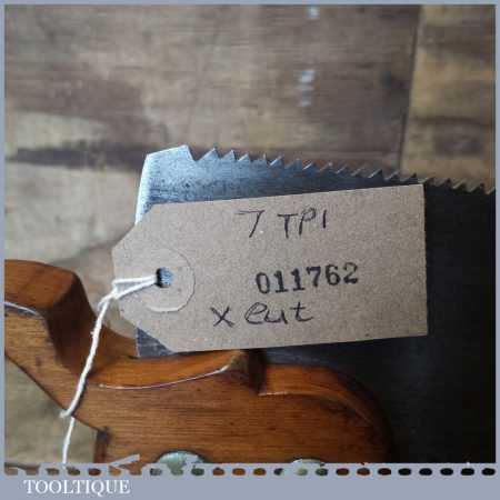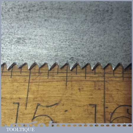 The saw has been thoroughly cleaned, jointed, resharpened and set by hand so that all the hard work of getting an old vintage saw right has been undertaken. We do this so that the next sharpening is easier and no more than a quick freshen up would be required. Those who are familiar with sharpening will know this is no small job and requires skill, effort and time to achieve good results.