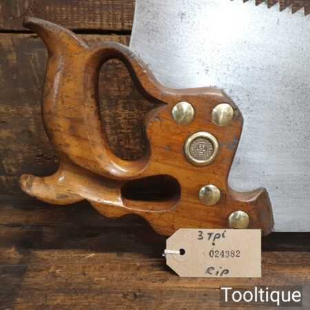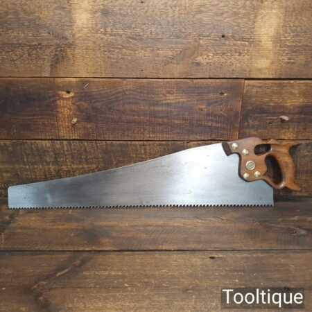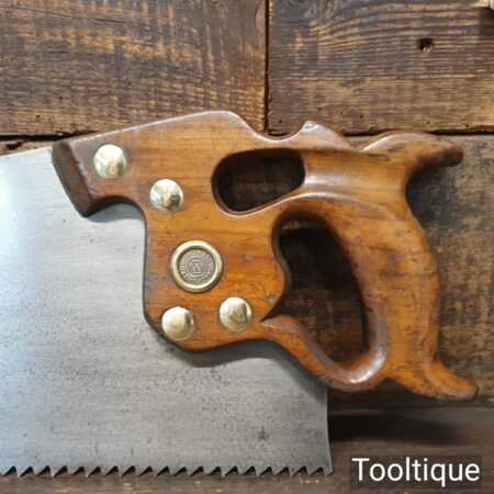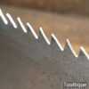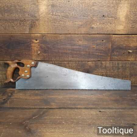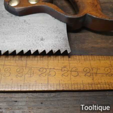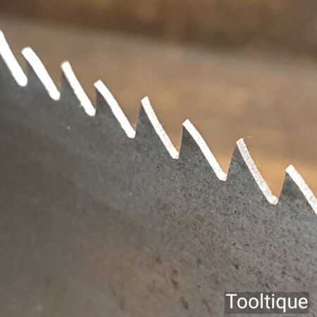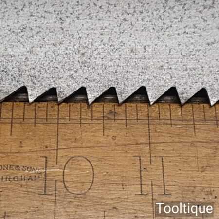 The saw has been thoroughly cleaned, jointed, resharpened and set by hand so that all the hard work of getting an old vintage saw right has been undertaken. We do this so that the next sharpening is easier and no more than a quick freshen up would be required. Those who are familiar with sharpening will know this is no small job and requires skill, effort and time to achieve good results.