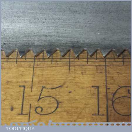 The saw has been thoroughly cleaned, jointed, resharpened and set by hand so that all the hard work of getting an old vintage saw right has been undertaken. We do this so that the next sharpening is easier and no more than a quick freshen up would be required. Those who are familiar with sharpening will know this is no small job and requires skill, effort and time to achieve good results.