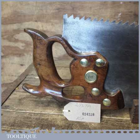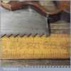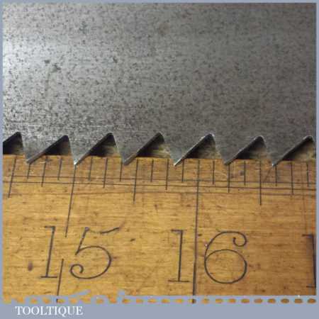 The saw has been thoroughly cleaned, jointed, resharpened and set by hand so that all the hard work of getting an old vintage saw right has been undertaken. We do this so that the next sharpening is easier and no more than a quick freshen up would be required. Those who are familiar with sharpening will know this is no small job and requires skill, effort and time to achieve good results.