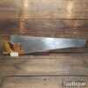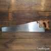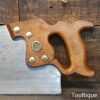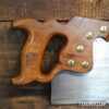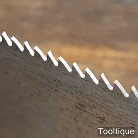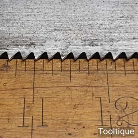 The saw has been thoroughly cleaned, jointed, resharpened and set by hand so that all the hard work of getting an old vintage saw right has been undertaken. We do this so that the next sharpening is easier and no more than a quick freshen up would be required. Those who are familiar with sharpening will know this is no small job and requires skill, effort and time to achieve good results.