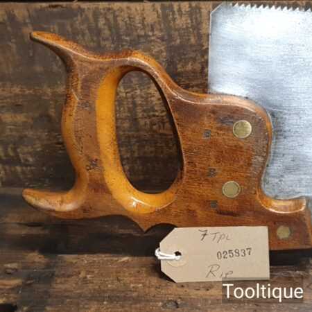 Vintage 26” Stains & Sons London N1 rip saw with 7 TPI, fully refurbished and sharpened ready for use. Note: Good smooth repair to the tip of the handle spur, lovely old English saw made in Sheffield.